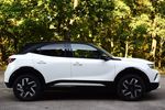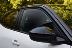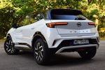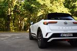 Opel Mokka Turbo Hybrid - tył z prawej Zmodernizowany Opel Mokka Turbo Hybrid wyróżnia się eleganckim połączeniem bieli z czarnymi akcentami oraz subtelnymi zmianami tylnej części nadwozia, gdzie zastosowano ciemniejsze klosze lamp i nowy wzór felg.