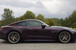 Mercedes-AMG GT 63 S E Performance Coupe - front z lewej Charakterystyczny przód auta z szeroko osadzonymi reflektorami i dużym grillem o pionowych żebrach. Bordowy lakier w połączeniu ze złotymi felgami podkreśla elegancję oraz sportowy charakter. Całość przyciąga uwagę i budzi respekt na drodze.